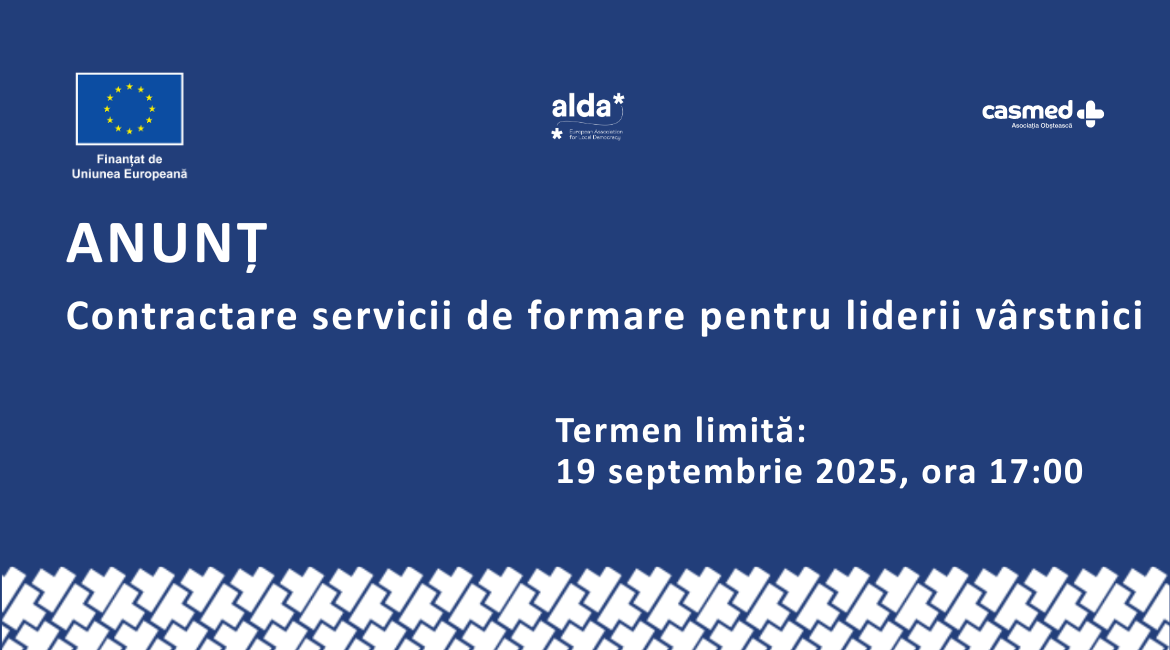 Asociația Obștească „CASMED” anunță un concurs public pentru selectarea unui trainer/unei echipe de traineri sau a unei companii specializate, care va dezvolta și livra un program intensiv de formare destinat liderilor comunitari vârstnici, în cadrul proiectului „Consolidarea participării vârstnicilor din Moldova în procesul decizional”, finanțat de Uniunea Europeană.