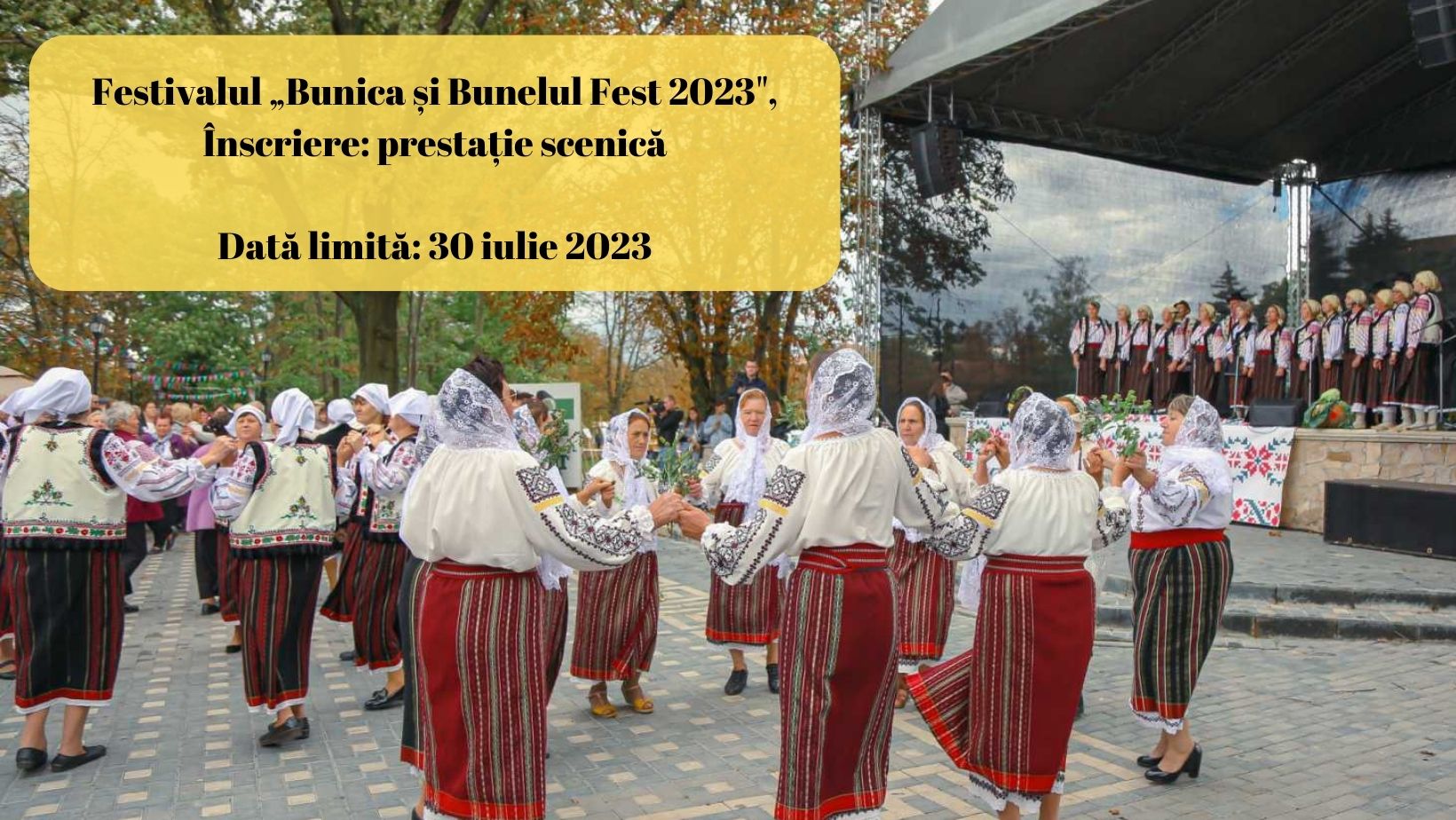 Anul acesta, Festivalul „Bunica și Bunelul Fest” invită grupurile de seniori să devină vedetele festivalului, să evolueze pe scena din or. Fălești, la data de 10 septembrie, 2023 (ziua de încheiere a festivalului).