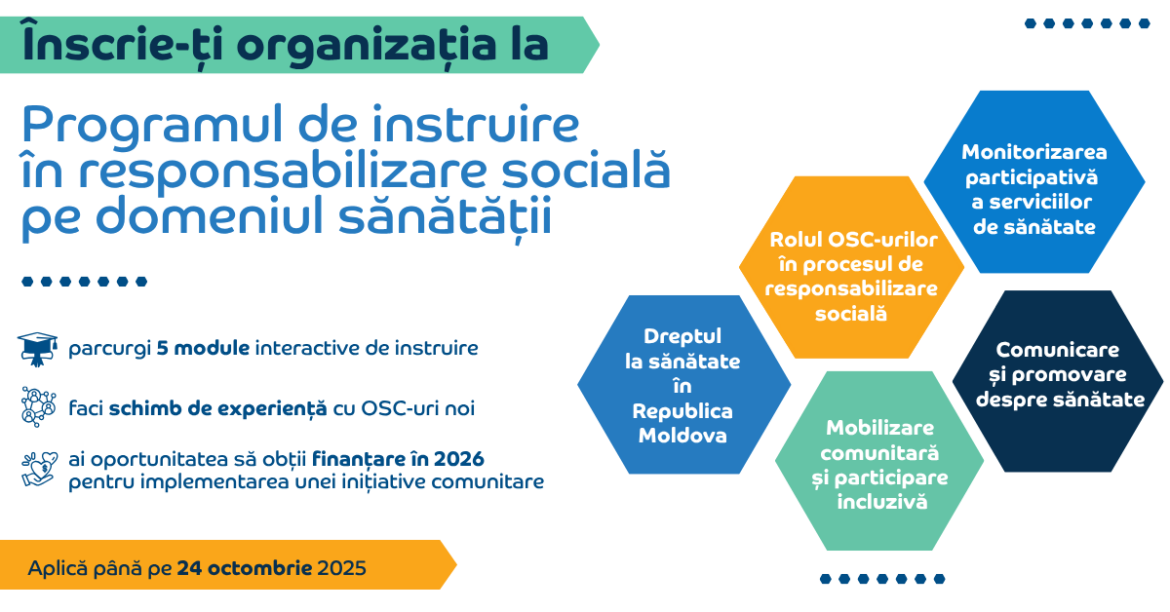 Новости и события (Română) Oportunitate pentru OSC-uri: Program de capacitare în domeniul responsabilizării sociale în sănătate Posted by Ana Spatari | 13.10.2025 Извините, этот техт доступен только в “Румынский”. Share this post About the Author:Ana Spatari